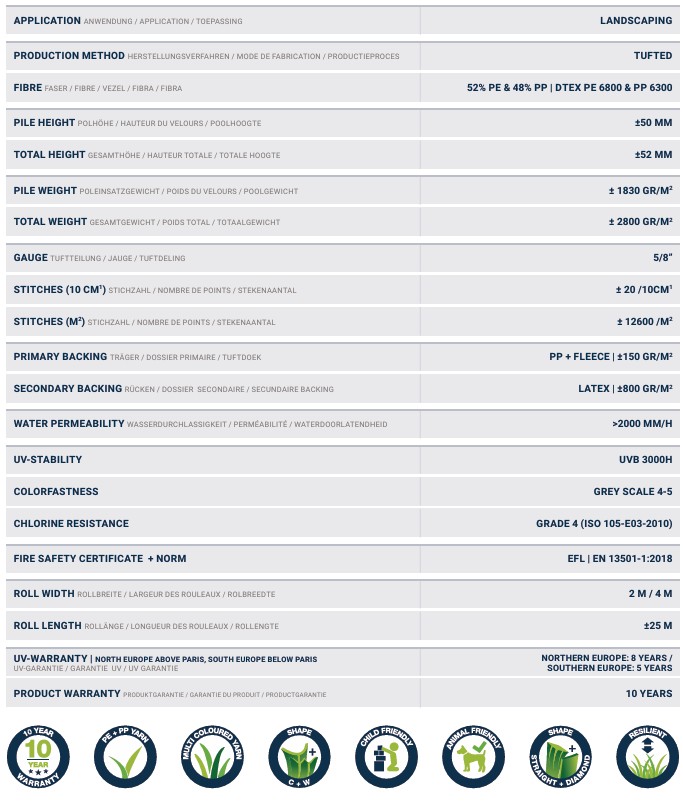Ervaar de luxe van Baron 50 kunstgras van Europe Grass: een weelderige 50mm hoge grasmat met een indrukwekkend totaal gewicht van 2725 g/m². Dit hoogwaardige product combineert een mix van PE & PP vezels met een dichtheid van 12.600 steken/m², wat resulteert in een uitzonderlijk realistische en volle uitstraling, perfect voor premium landscaping.